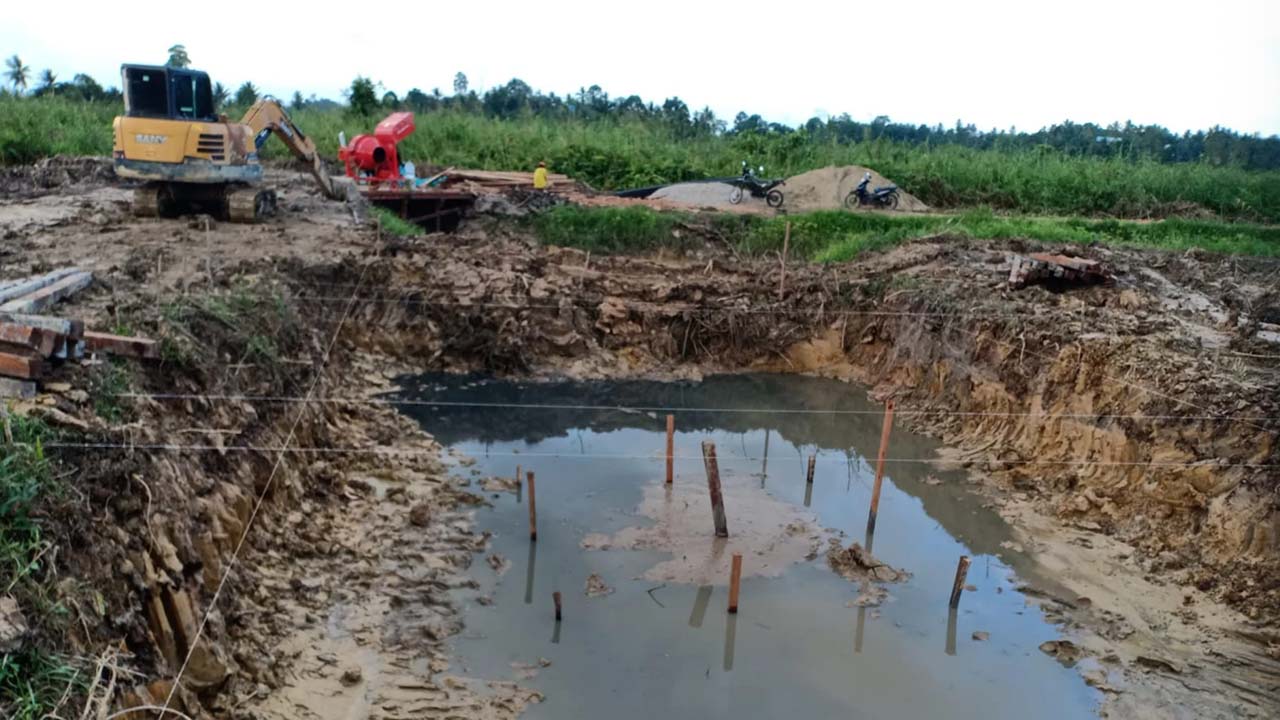 Setidaknya ada 40 batang kayu ulun dengan ukuran 10 x 10 x 4 yang akan digunakan sebagai tiang pancang untuk menopang tekanan air nantinya.